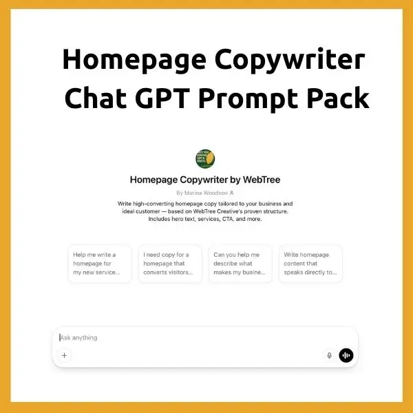 You’ll get instant access to WebTree Creative’s custom ChatGPT prompt, built to help you define your audience and write homepage sections that actually convert. Plus, we’ve included an editable Canva wireframe and a polished homepage mockup so you can visualize the end result.